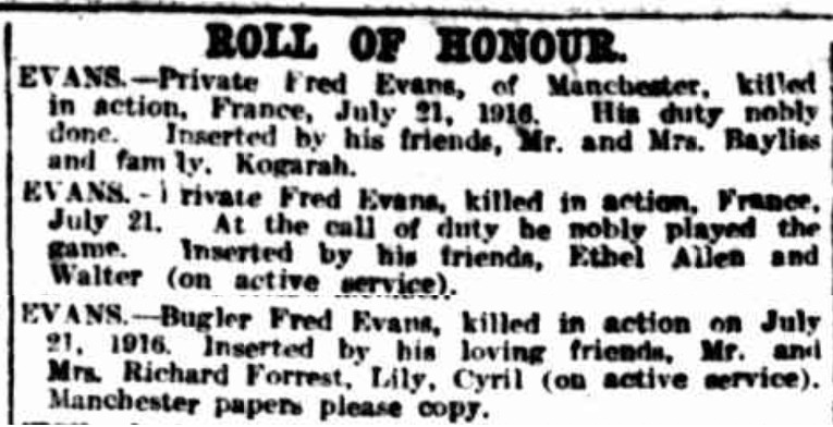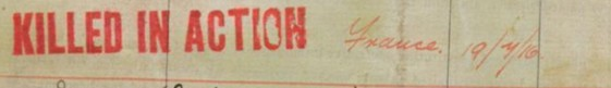 Fred was initially reported as one of those missing, but a formal review on 6 September 1916 declared him as having been killed in action on 19 July 1916.