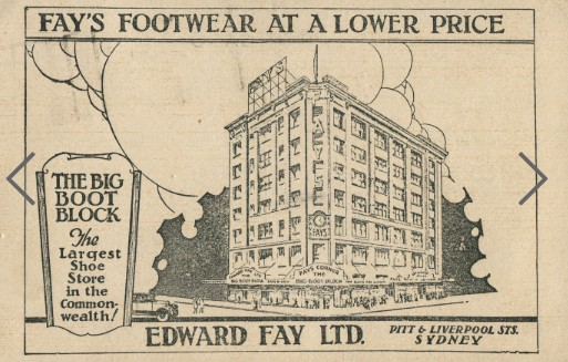 He attended Fort Street High School, one of Sydney’s most prominent public schools, where he was remembered as bright, sociable, and active. As a young man, Roy worked as a boot salesman in Sydney’s bustling commercial heart. He was employed by Edward Fay Limited, popularly known as “The Big Boot Block”, located on the corner of Pitt and Liverpool Streets. The company promoted itself as “The Largest Shoe Store in the Commonwealth.” and was eventually purchased by Coles Myer.