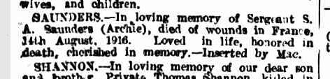On 29 July, Rachel Saunders received a telegram that her son was dangerously ill, and she advised Miss McKim in Sydney, both cabled the Army. Despite seeing a newspaper report of Archie’s death, Rachel received telegrams on 8 and 16 August that his condition was “improving” but, as noted in his record, Sergeant Samuel Archie Saunders had: