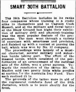 Arthur felt the call to war and he enlisted in mid-July 1915 in Sydney. He was allocated to the newly formed 30th Battalion as a private in C Company. Training commenced in the Liverpool camp, but in September they were moved to the Royal Agricultural Show Grounds in Moore Park, Sydney. There were numerous reports of their activities in the papers.