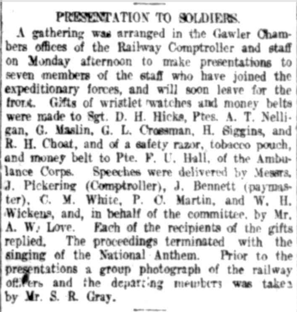 On 4 October, the Railway Comptroller and staff held a presentation for Gordon and the other six men who had enlisted in July. Gordon, along with the others, were presented with a wristwatch and a money belt.
