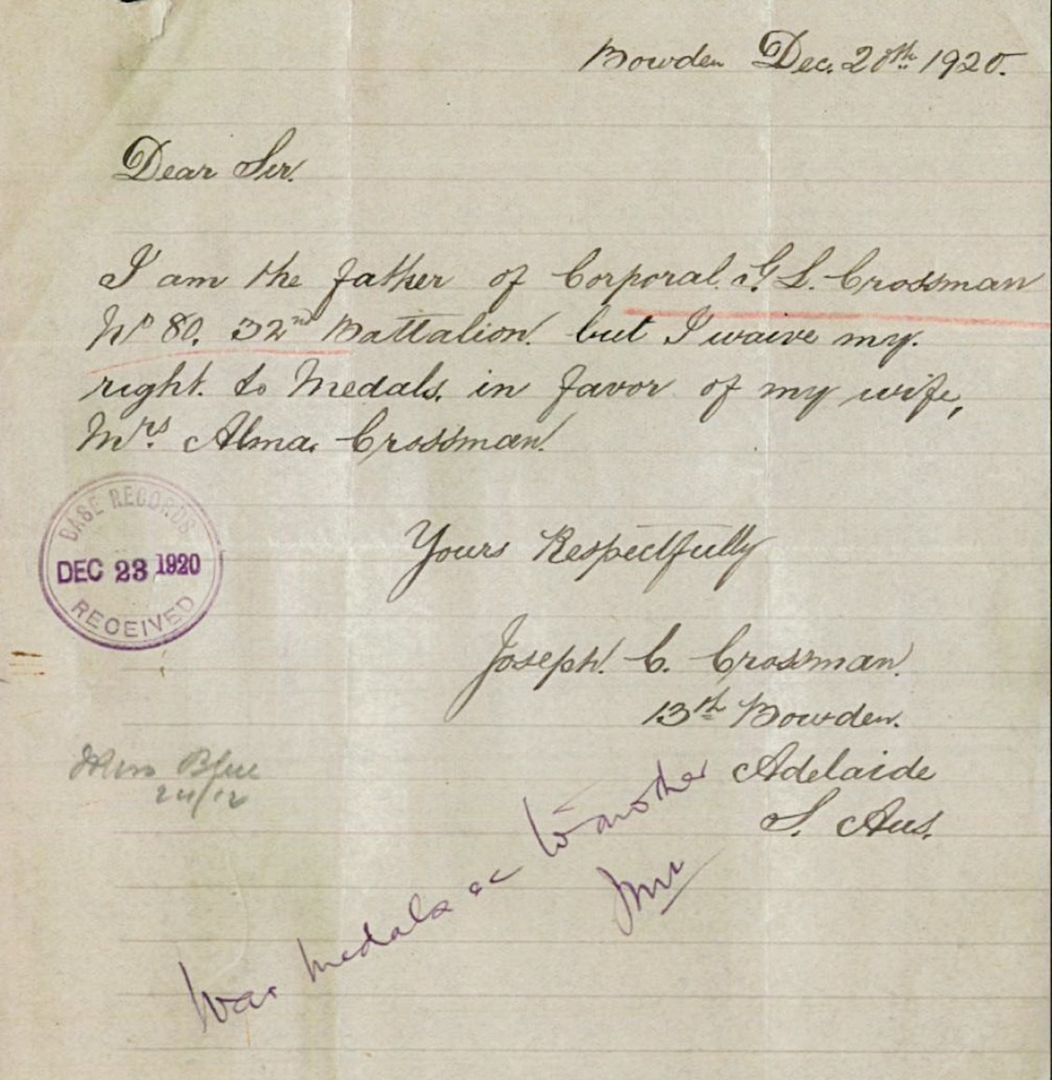 However, when it came to distribution of a dead man’s medals, the next of kin was not necessarily the recipient. The order of precedence was widow, eldest surviving son, eldest surviving daughter, father, mother, eldest surviving brother, eldest surviving sister, eldest surviving half-brother, eldest surviving half-sister. Alma Crossman did not reply, but Gordon’s father, Joseph, wrote to Base Records, waiving his right to the medals in favour of his wife, and the medals were sent to Alma.