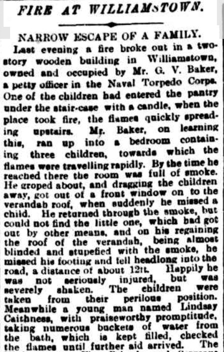 In October 1890, when William was just eight months old, a serious fire broke out in the family home at Williamstown. The blaze began when one of the older children accidentally set alight the pantry with a candle. George rushed upstairs through the smoke to rescue three of the children trapped in a bedroom, carrying them out through a window and onto the verandah roof. Thinking one child was still inside, he re-entered the smoke-filled room, but the missing child had already found her way to safety. Almost blinded by smoke, George lost his footing and fell from the verandah roof into the street below, a distance of some twelve feet. Fortunately, he survived with only bruising and all the children were saved.