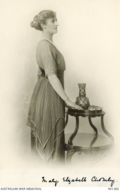 Mary Chomley was born in 1871 at Malvern, Vic and worked for the Red Cross Society and contributed to the struggle for the equality of women both in Victoria and in England. In London during the war, she worked at the Princess Christian's Hospital for Officers from 1915-1916 and was secretary of the Prisoners of War branch of the Australian Red Cross, London, from 1916-1919. She was appointed as Officer of the Order of the British Empire (Civil) on 15 March 1918 for her contribution to the Red Cross Society.